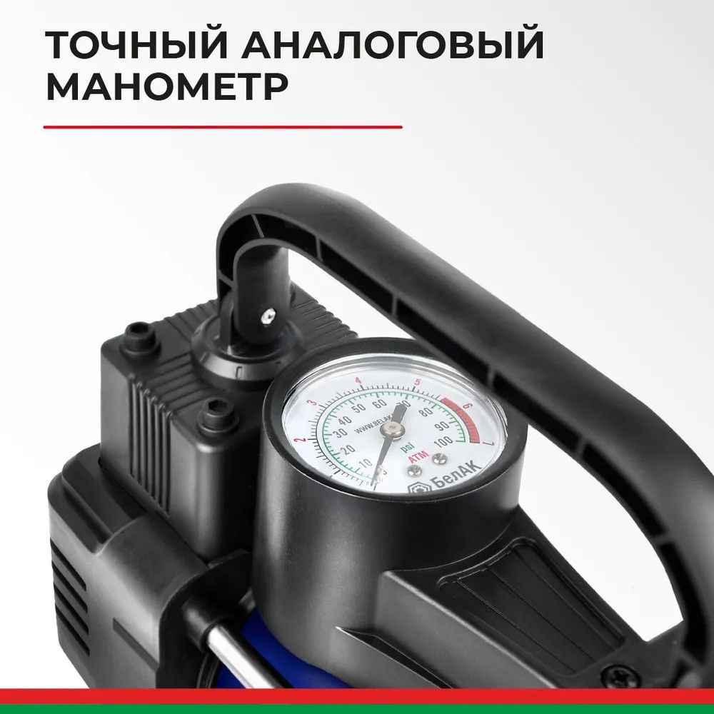 Для увеличения срока службы и достижения высокой мощности (55 л/мин, 180Вт) в этой модели применяется металлический поршень, что позволяет накачивать колесо R16 за несколько минут.