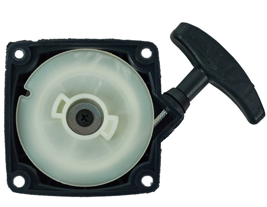 Стартер ручной для мотокосы с двумя зацепами (усами) представляет собой механизм, предназначенный для запуска двигателя мотокосы. Он состоит из корпуса, шнура, ручки и системы зацепов, которые взаимодействуют с маховиком двигателя. При вытягивании шнура зацепы входят в зацепление с маховиком, что позволяет провернуть коленчатый вал и запустить двигатель. Такой стартер обычно используется в бензиновых мотокосах и обеспечивает надежный запуск при правильной эксплуатации.